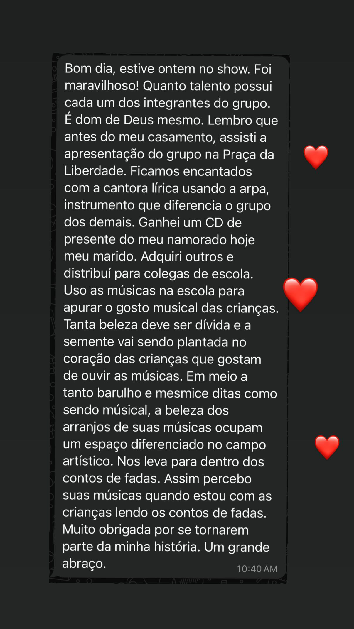 Depoimentos como esses nos motivam a seguir nosso caminho, espalhando música e emoções por onde passamos. Esperamos você nas próximas noites de encanto!